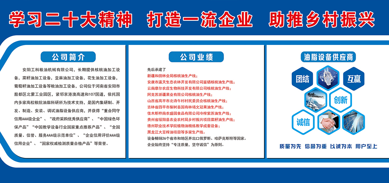 安陽工科糧油機械有限公司,長期提供核桃油加工設備,茶籽油加工設備,菜籽油加工設備,亞麻油加工設備,花生油加工設備,葡萄籽油加工設備等糧油加工設備,公司位于河南省安陽市殷都區(qū)北蒙工業(yè)園區(qū),緊鄰京港澳高速和107國道,依托國內(nèi)多家高校糧院油脂科研所為技術(shù)支持,是國內(nèi)集研制、開發(fā)、制造、安裝、調(diào)試油脂設備供應商,并獲得“重合同守信用AAA級企業(yè)”、“政府采購優(yōu)秀供應商”、“中國綠色環(huán)保產(chǎn)品”“中國教學設備行業(yè)國家重點推薦產(chǎn)品”、“全國質(zhì)量、信譽、服務AAA級示范單位”、“企業(yè)信用評價AAA級信用企業(yè)”、“國家權(quán)威檢測質(zhì)量合格產(chǎn)品”等榮譽。先后承建了新疆和田林業(yè)...